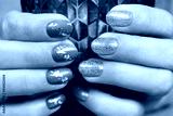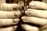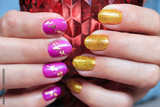 Female hands with a gold and purple colour nails. Nail design. Artistic manicure with gel polish