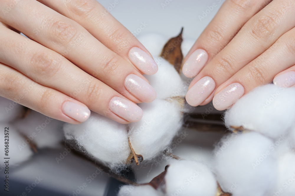 Women's hands with a beautiful pink manicure with glitter. Nail design. Manicure with gel polish close-up