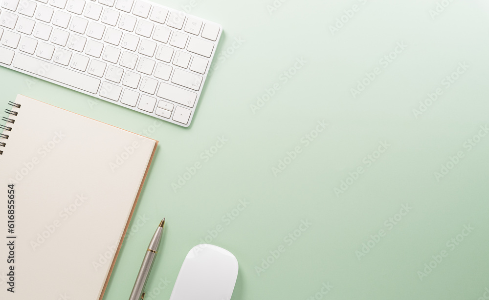 Flat lay, top view office table desk. Workspace with keyboard and office supplies on pastel background.