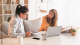 Academic support. Home teacher. Teenage student lesson with tutor preparing for exam sitting table in light room interior.