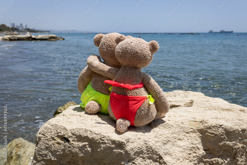 Teddy bear couple in swimsuits sitting on big rock in front of the sea