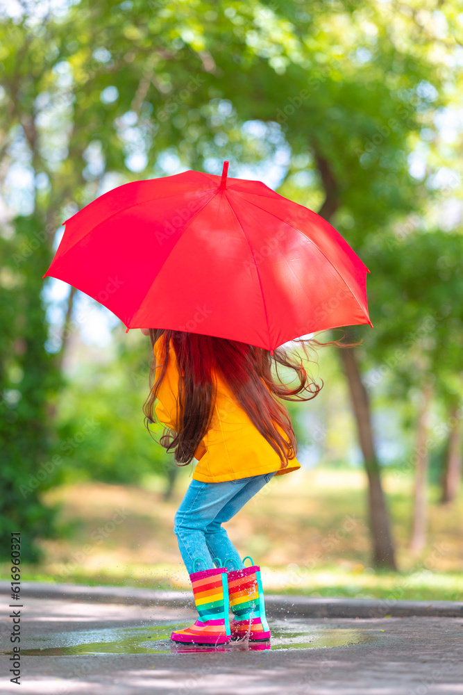 Happy beautiful girl with umbrella and color rubber boots jump on a rainy puddle