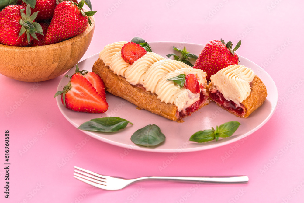 French eclair grazed with chocolate and fruity strawberry cream or sweet Italian profiteroles and fresh juicy strawberries