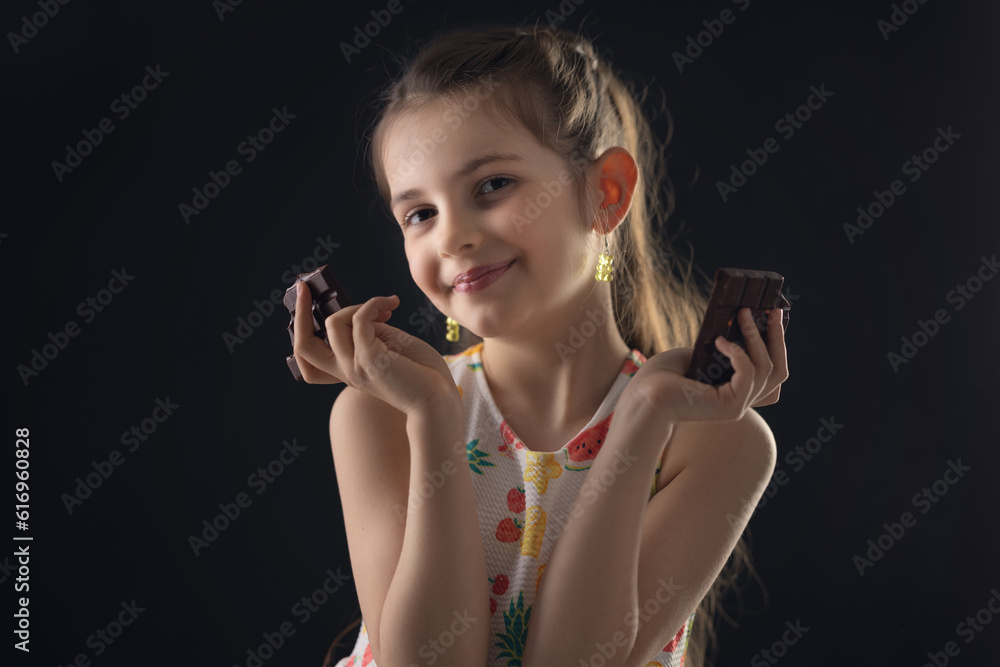 Chocolate and pretty hungry little woman portrait. Beautiful girl ready to eat chocolate bar.