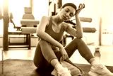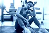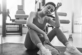 Exhausted female athlete in activewear sitting tired in gym after workout