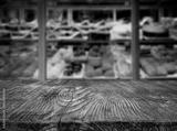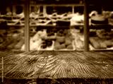 An empty wooden table against the background of a display case with sweets. Cafe, restaurant, coffee shop. Background. The backdrop. Evening. Night. Interior. Confectionery. Sweets. Copy space