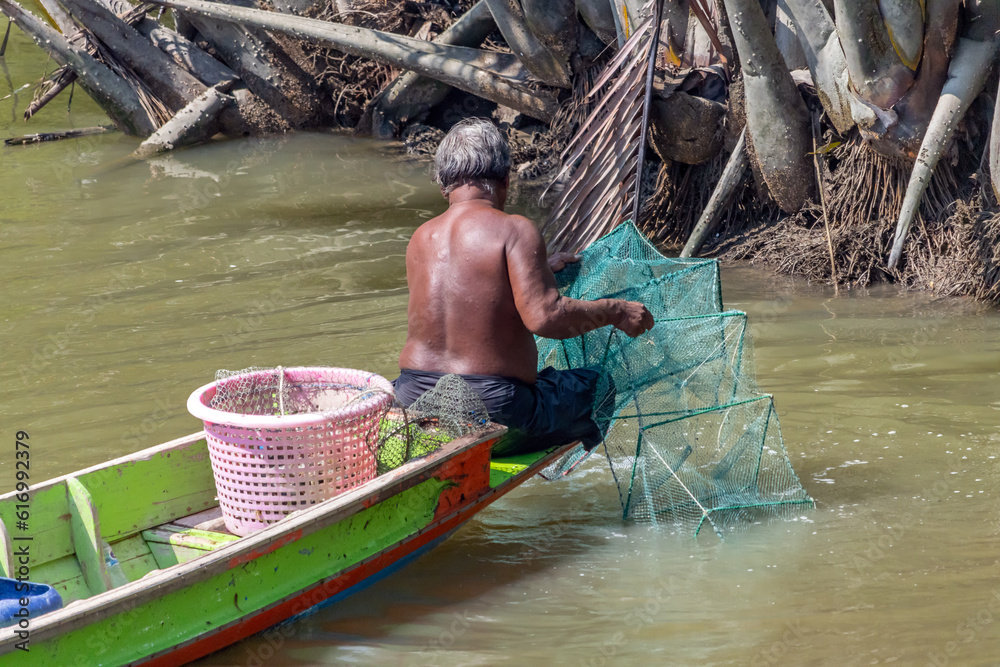 A fisherman puts nets in the water off a tropical coast