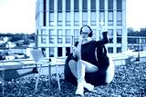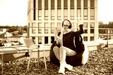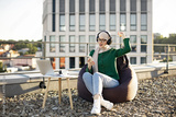 Emotional muslim lady in hijab singing along musical phrases in headphones while resting in pouf chair on terrace. Excited young woman rocking out to energetic tunes of favourite melodies outdoors.