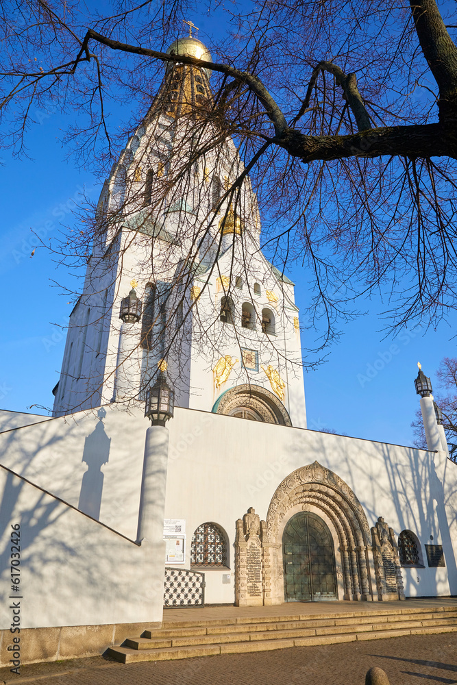 Schöner Blick auf die berühmte russische Gedächtniskirche in der Nähe des Völkerschlachtdenkmals in Leipzig, Deutschland.