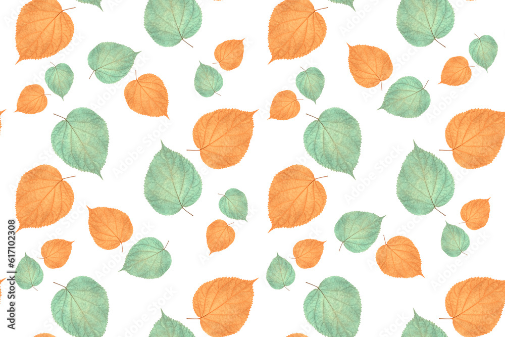 Pastel color linden leaves on white background, seamless pattern. Design for fabric, wallpaper, wrapping paper.
