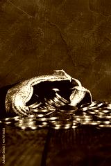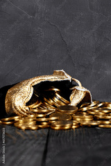 A bag with gold coins on a wooden background. The money is in a black bag. Treasure Hunt. A Purse with money on a black background. Wallet wit gold coins.Copy space