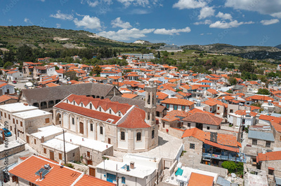 View of Omodos village and Timios Stavros Monastery. Limassol District, Cyprus
