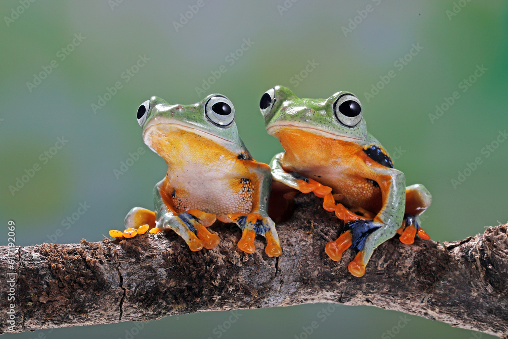 A pair of Flying Frogs (Rhacophorus reinwardtii) on tree branch.