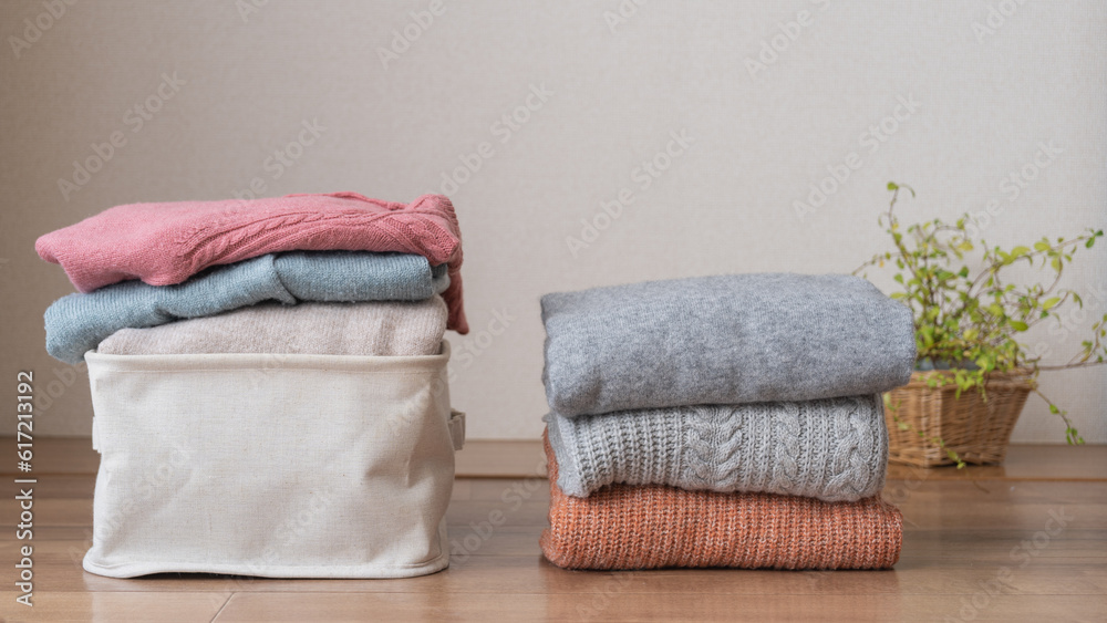 たたまれた冬物の服|洗濯物・衣替え・リサイクル イメージ