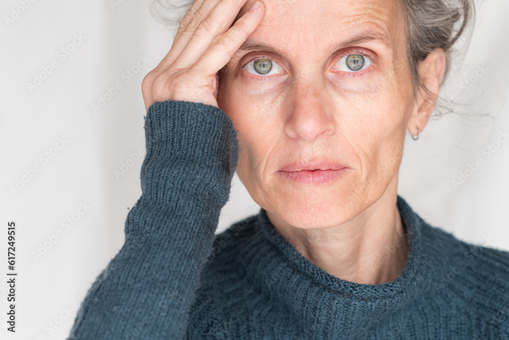 Close up portrait of older woman in blue sweater with hand on head looking at camera (selective focus)