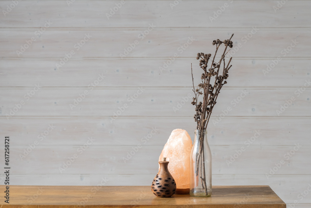 Close up of dried seed pods on oak shelf with himalayan salt lamp against white painted wood panelled wall (selective focus)