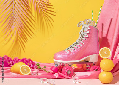 Summer creative layout with pink roller skate with ice cubes, lemons, flowers, pink curtain, pink palm leaf on pastel pink and yellow background. 80s or 90s retro aesthetic refreshment idea.