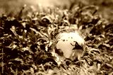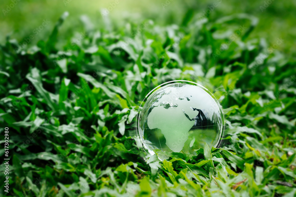 Crystal earth on the grass in a green grass forest with sunlight. Environment, save the World, earth day, ecology, and Conservation Concepts for Sustainable Development. Reduce CO2 emission concept.
