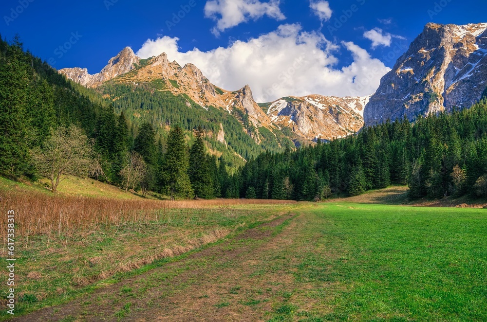 Spring mountain landscape in Polish mountains. Small Valley Meadows in the Western Tatra Mountains.