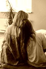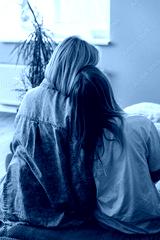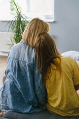 Young loving mother hugging her teenage daughter, mom demonstrating unconditional love for child, mommy cuddling supporting teen girl while spending time together at home. View from the back
