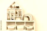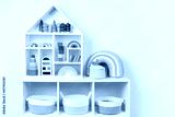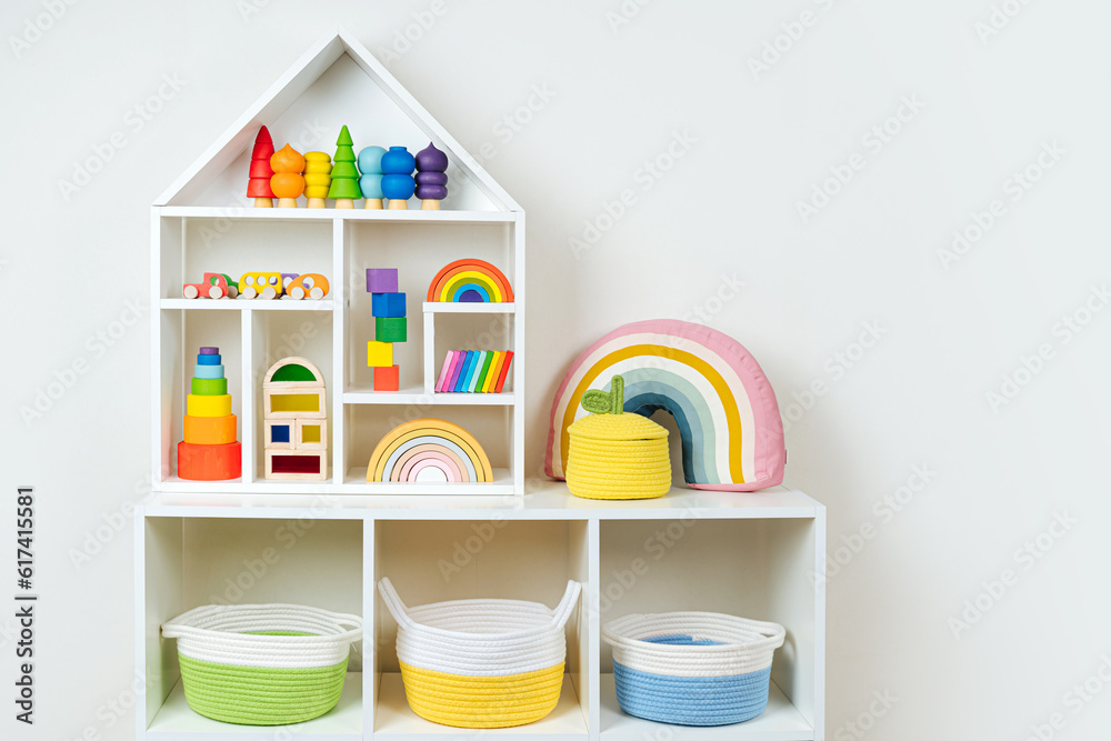 White shelving with rainbow wooden toys and colorful storage baskets. Interior design. Organizing and storage ideas in nursery.