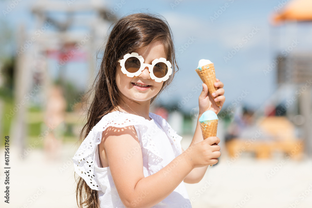 Beautiful little girl in sunglasses and white summer shirt eating an ice cream. High quality photo