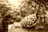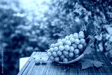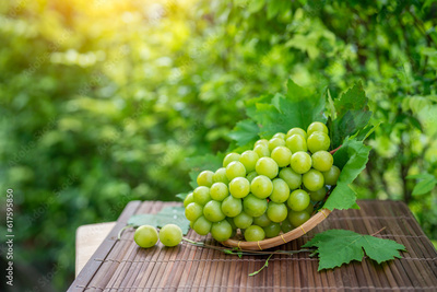 Green grape in Bamboo basket on wooden table in garden, Shine Muscat Grape with leaves in blur background,