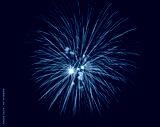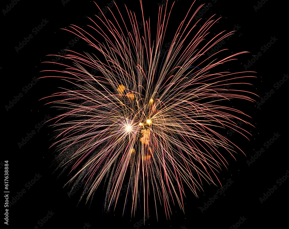 Colorful celebration fireworks isolated on a black sky background.
