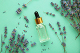 Flat lay composition with lavender flowers and lavender oil on mint background