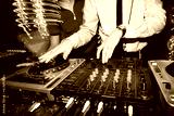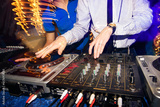 DJ hands mix music on professional mixer in booth at a party in nightclub