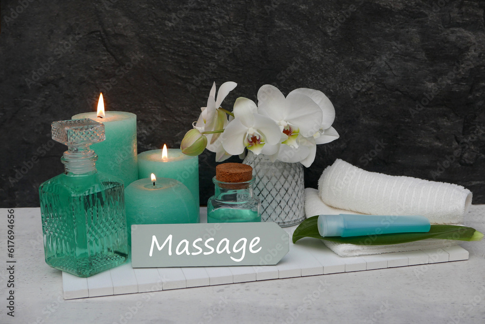 Spa Komposition mit Massageöl, Kerzen und Orchideenblüte.
