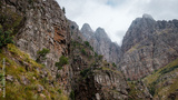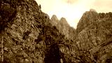 Dramatic mountain scenery with and rocky cliffs and clouds background.
