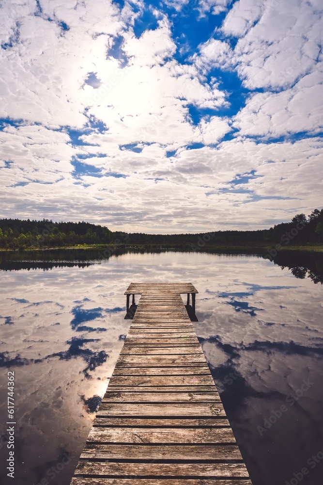 Beautiful summer afternoon landscape by the lake. Charming wooden pier over a small lake in Michala Gora, Poland.