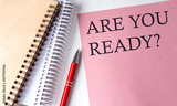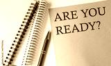ARE YOU READY word on the pink paper with office tools on white background