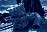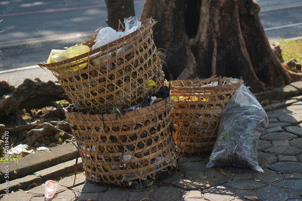 Portrait of a trash can and a pile of garbage at the Bandengan beach resort. Jepara, Indonesia April 11, 2023