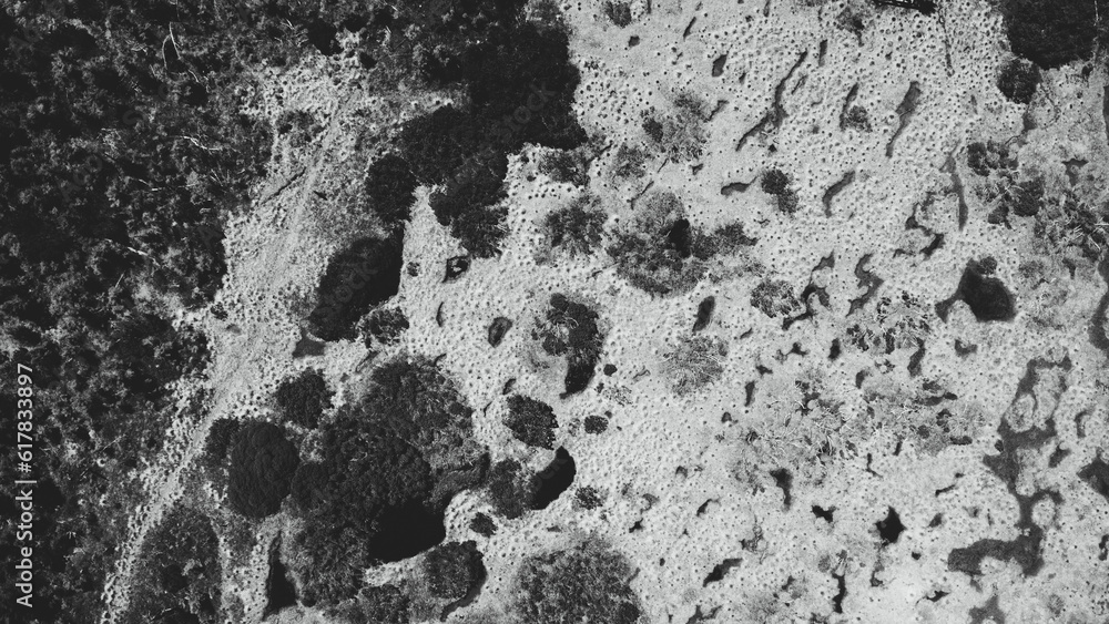 Aerial top view of summer black and white trees in the forest. Forest from a bird's eye view. Drone top down photo.