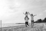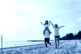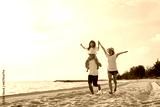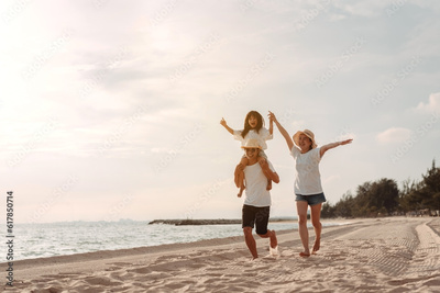 Happy asian family enjoy the sea beach. father, mother and daughter having fun playing beach in summer vacation on the ocean beach. Happy family with vacation time lifestyle concept.