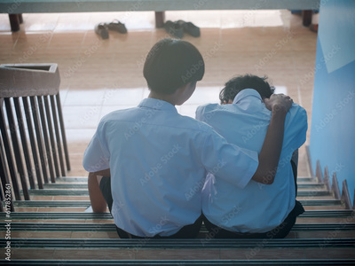 Two students sit down and hug to support a depressed man - a man supports his friend in despair for his love problems. The concept of best friends