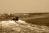 Police officers in uniform patrolling on the river on a boat