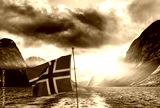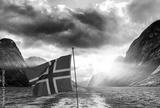 Norwegische Schiffsflagge an einem Schiff in einem Fjord in Norwegen