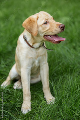 Active, smile and happy purebred labrador retriever dog outdoors in grass park on summer day.