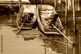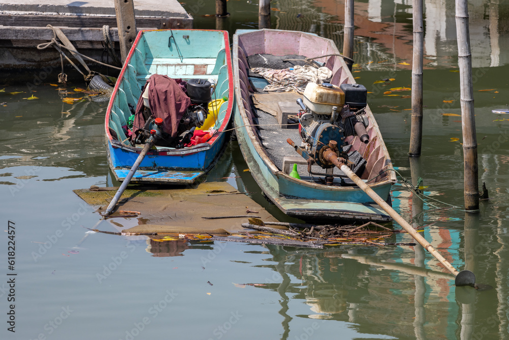 A traditional long-tail motor boats anchored in a water canal in outskirt of Bangkok, Thailand