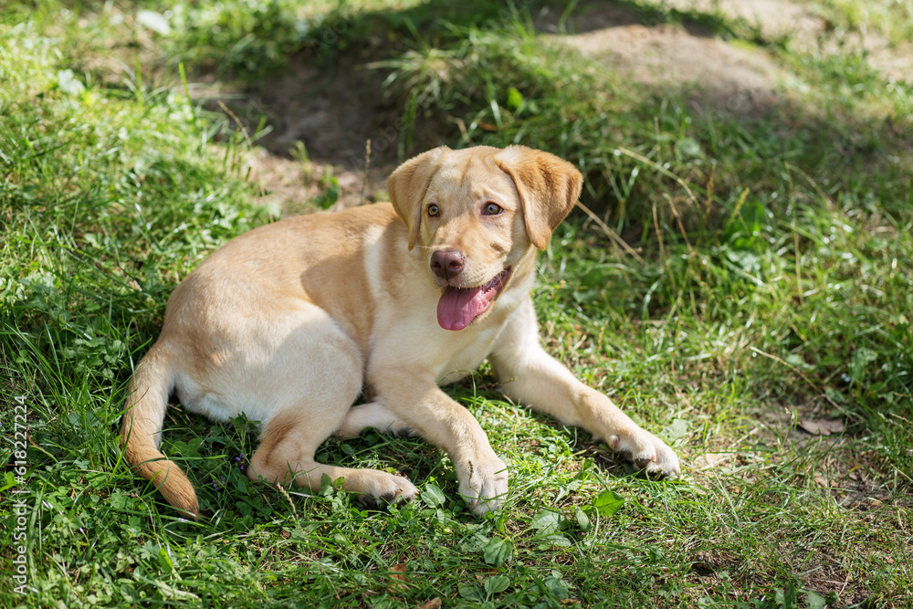 Active, smile and happy purebred labrador retriever dog outdoors in grass park on summer day.