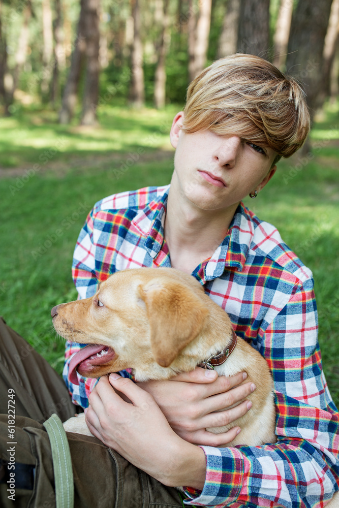 Teenage boy hugs labrador dog in park in summer. Friendship and pets concept.