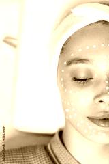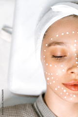 Cosmetology concept. Skin care. Close-up vertical photo of a half face of a beautiful relaxed woman with moisturizing anti-aging cream on her face to prevent premature wrinkles, lies in a beauty salon