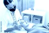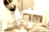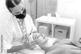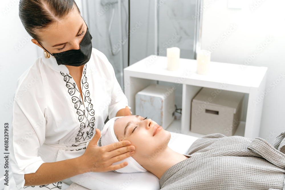 Facial massage in spa salon. Woman massage therapist makes face massage to caucasian relaxed woman lying on couch with closed eyes. Lifting facial massage, skin care, facial skin youth support