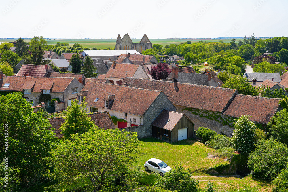 Aerial view of the unfinished Saint Lubin Church in Yèvre-le-Châtel in the French department of Loiret, Centre Val de Loire, France