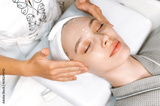 Facial skin care. Caucasian relaxed woman with eyes closed makes procedures in the salon, receives facial massage with moisturizing cream, takes care of skin youth, prevents wrinkles