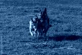 Long-haired German shepherd dogs playing on the green grass in the forest