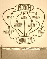 problem and solution, brainstorming or decision making concept with basic questions, mind map sketch on art paper